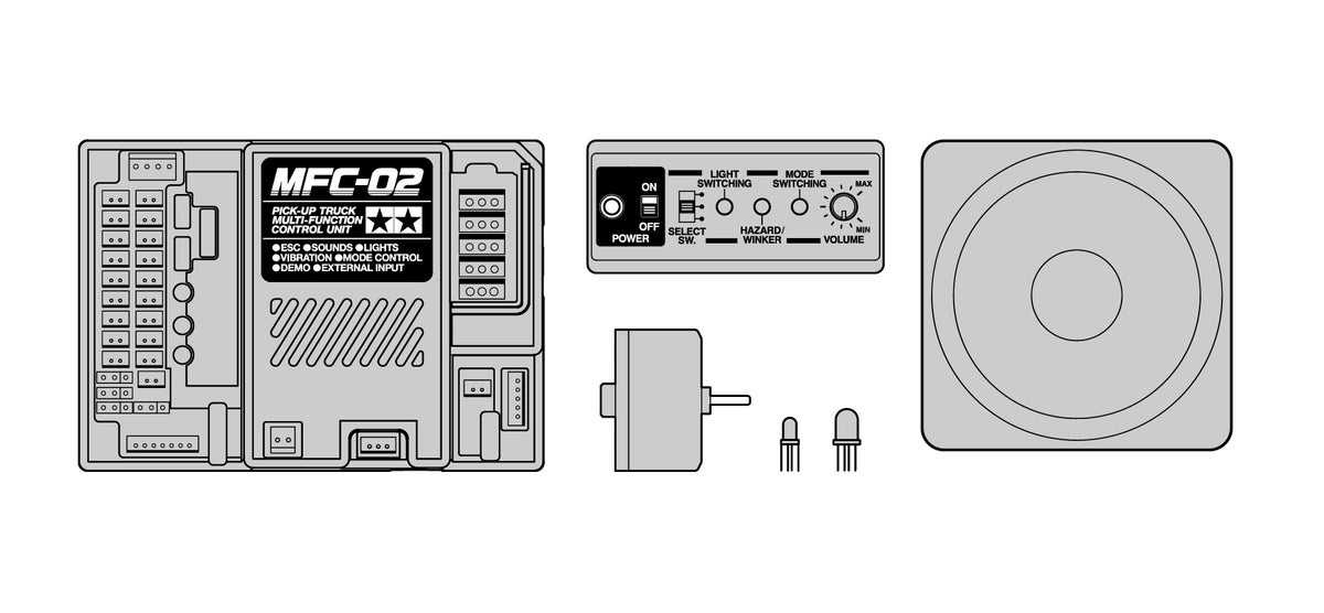Built to easily fit into Tamiya 1/10 electric RC pickup trucks such as the Ford F-350 High Lift, Toyota Hilux etc., Tamiya adds authentic feeling by linking the real sound, the functions of various lights, and body vibration together. The engine sound can be selected from two types of large displacement V8 and small displacement turbo engines: engine start sound, idling sound, throttle operation. In addition, the engines sound will change when actually changing as you shift through the gears. Furthermore, the body vibration changes according to the engine rotation number which gives the model a sense of weight. This unit can also be used for various lighting control.